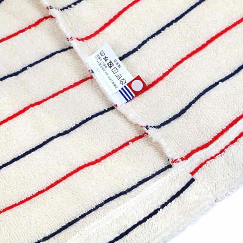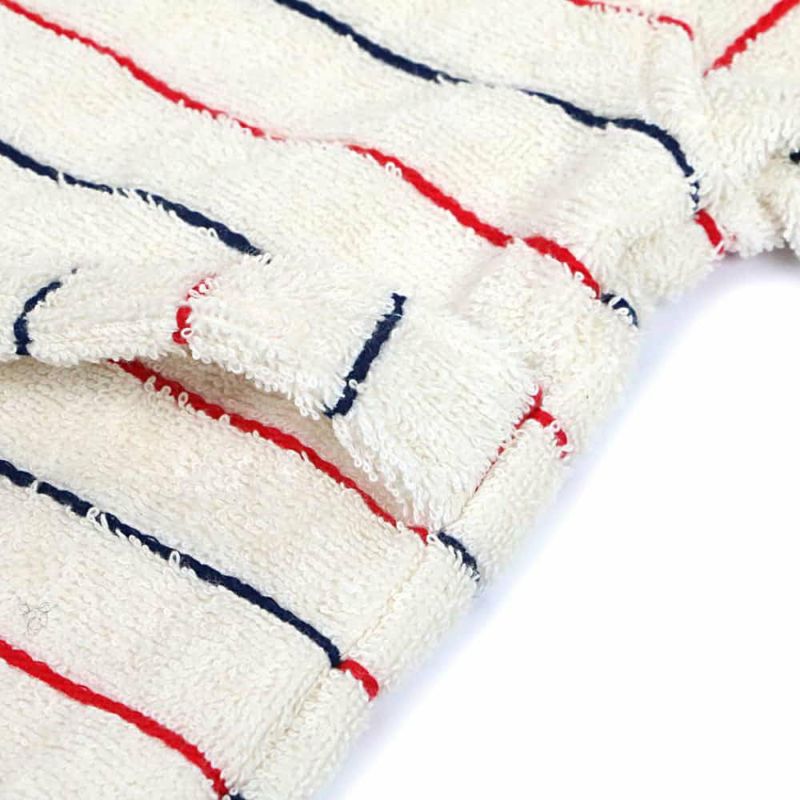 オーガニックコットンのタオル地をベースに、レッドとネイビーのストライプが入った、トリコロールカラーの赤ちゃん用バスローブです。かわいいフードに、紐も付いて便利!