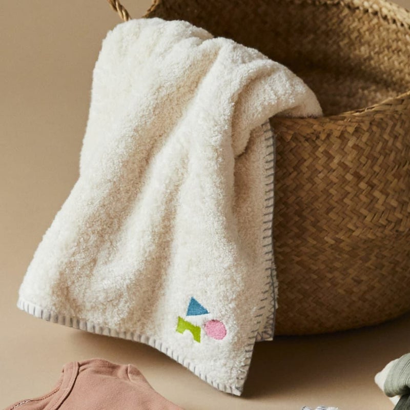 ふっくらとしたオーガニックコットンを、ボリュームたっぷりなロングパイルで贅沢に使いました。いつまでも変わらない肌ざわりのやさしさを追求し、赤ちゃんから子供まで性別関係なく遊べる「積み木」のモチーフは知育を願う思いをこめています。