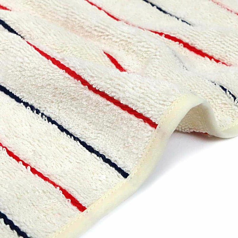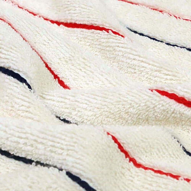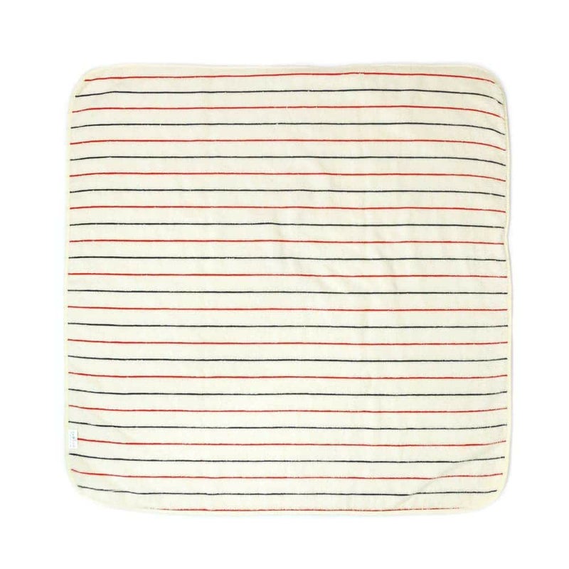 オーガニックコットンの優しいタオル地をベースに、レッドとネイビーのストライプが入ったトリコロールカラーのフード付きおくるみです。