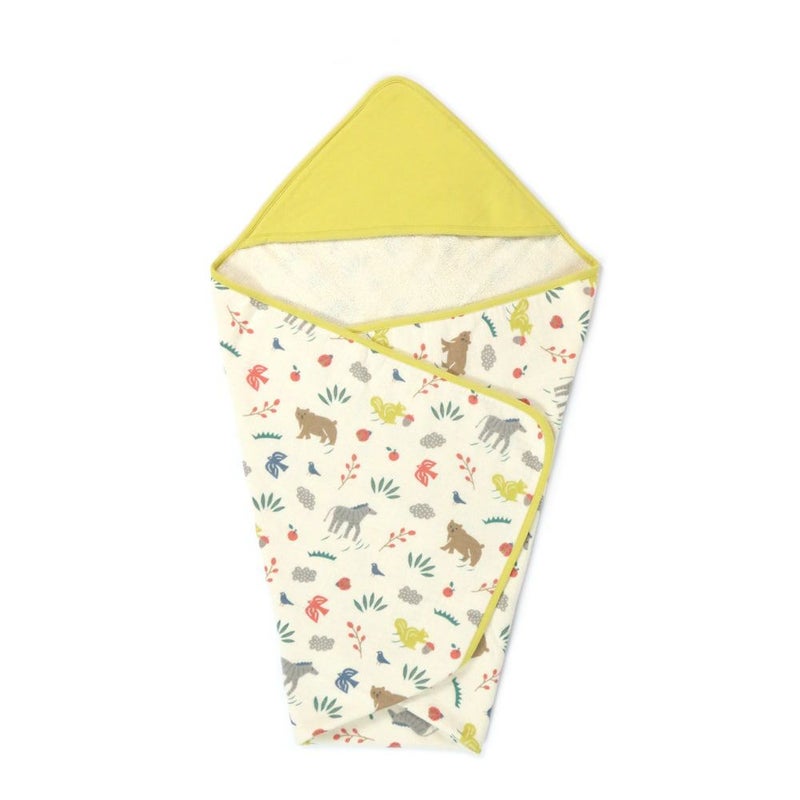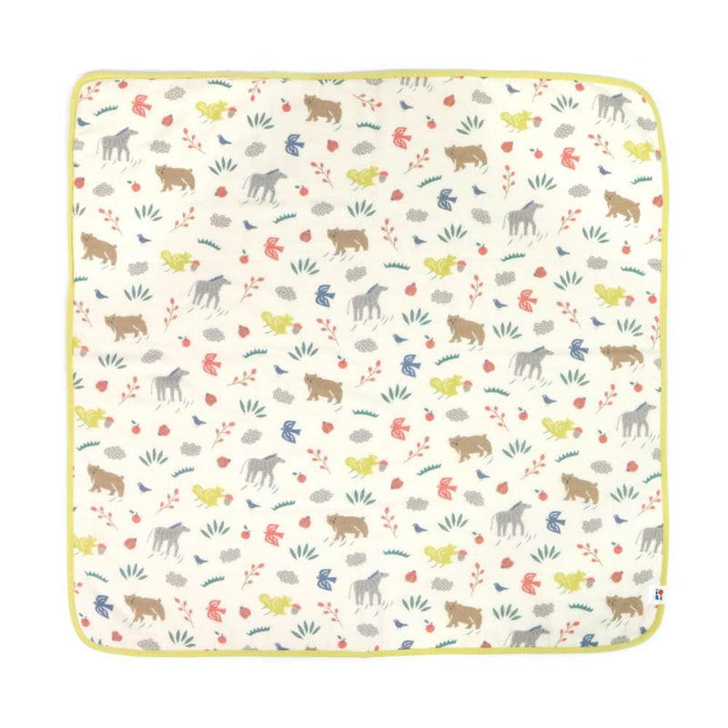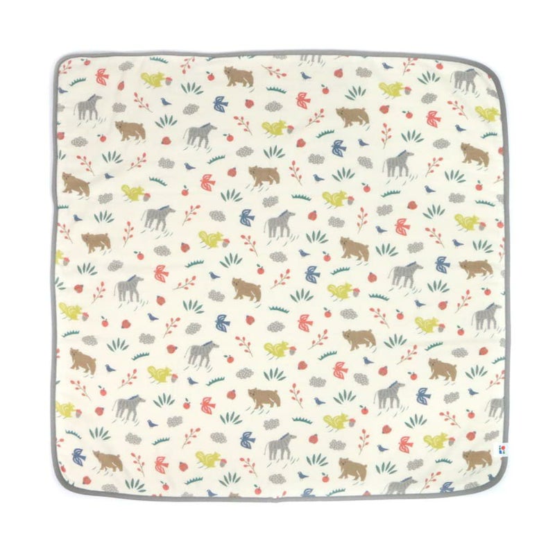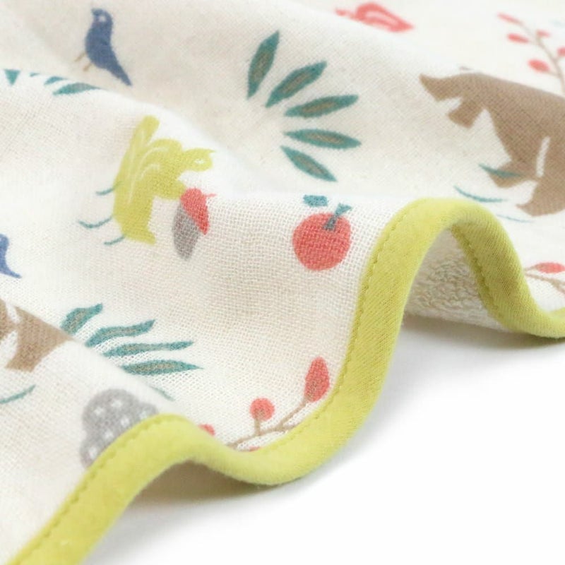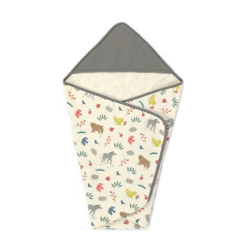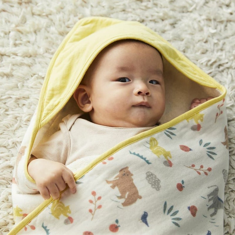オーガニックコットンのやさしいキナリをベースにたのしい動物たちがあしらわれたデザインで、あかちゃんをやさしくゆったり包み込んでくれます。