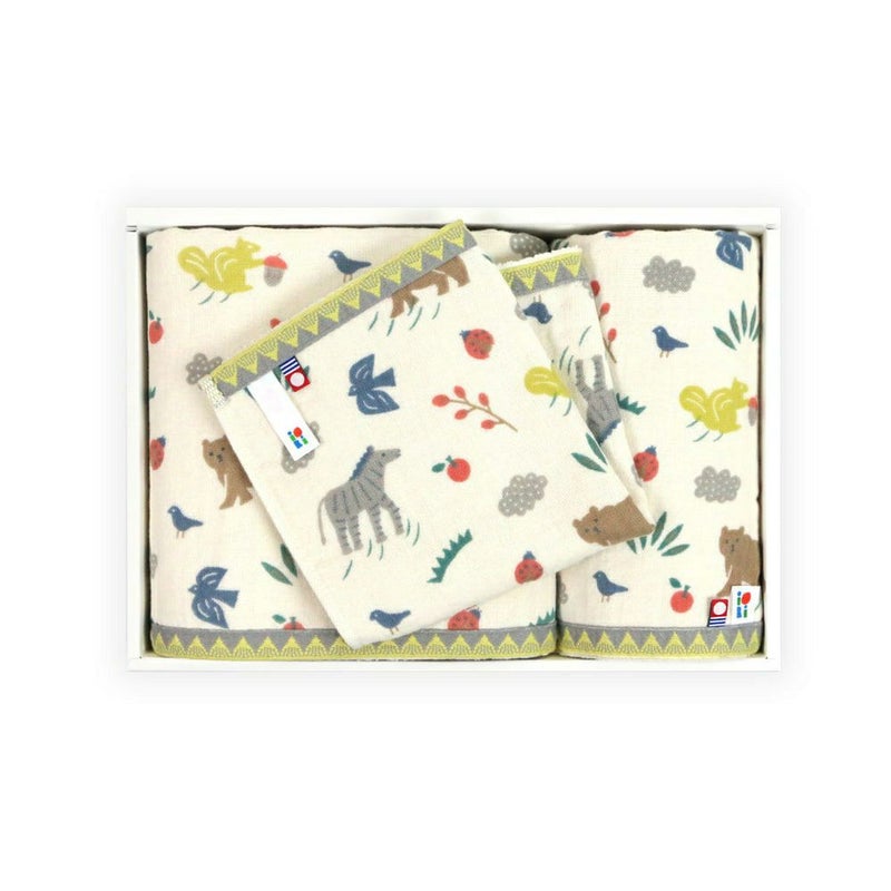 絵本の中から飛び出してきたような愛らしい動物たちが描かれたオーガニックコットンのベビーシリーズ『alku-アルク』のバスタオル、フェイスタオル、ハンドタオルをお入れしたベビーギフトセットです。性別問わずお使いいただけるデザインとなっておりますので出産お祝いのギフトにもピッタリです。