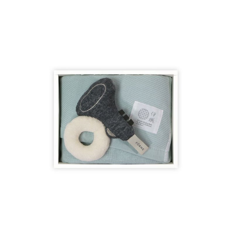 「子育てをするママが本当に欲しい」と思えるベビーアイテムをコンセプトに作られた『IORI BABY×FORNE オーガニック』のラトル(ラッパ)と、肌に滑り込むようなさらりとした感触の究極のやわらかガーゼ『momo-モモ』フェイスタオル(ブルー)をお入れしたベビーギフトセット。