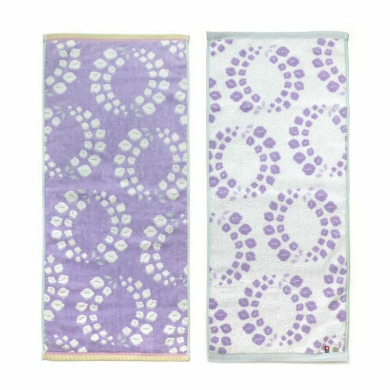 花言葉は歓迎、優しさ、忠実。優雅でしとやかな和の花である藤を、無撚糸シャーリングを使って立体的なリースのように表現した『fuji-フジ』と、抗菌・防臭機能を備えた、高機能な定番タオル。肌触り、適度なボリューム感、吸水性、洗濯耐久性などバランスの良い使い心地な『IORINO/きよらか』のフェイスタオル2枚組ギフトセットです。ご自宅用にはもちろん、「歓迎」の花言葉を添えた贈り物としてもおすすめです。