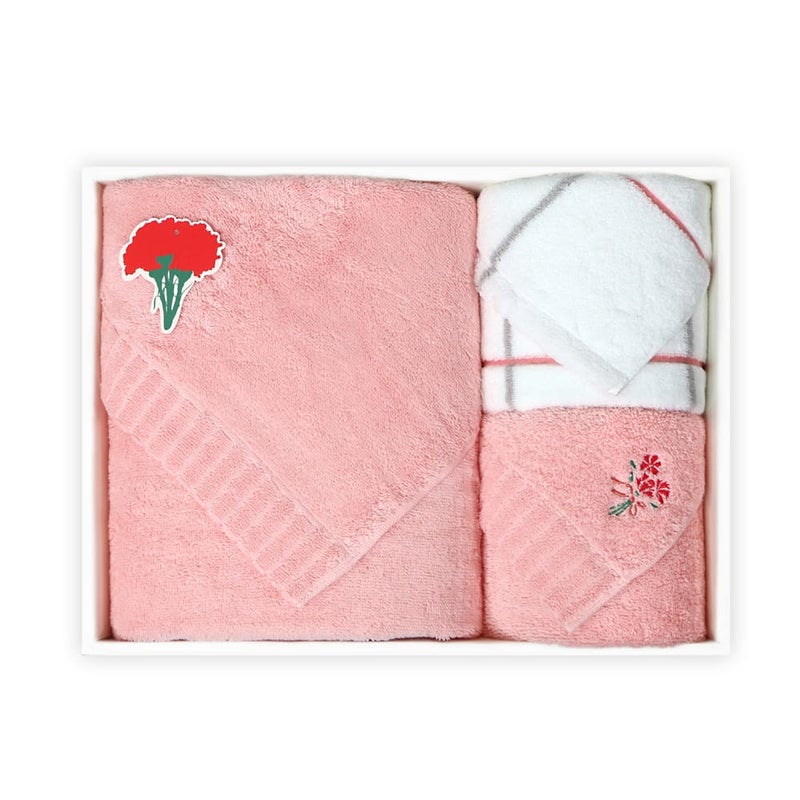 やさしいピンクのフェイスタオルに母の日限定のカーネーションの刺繍をあしらった、
