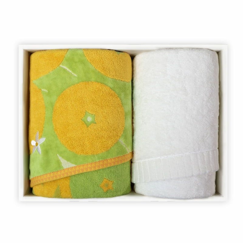 愛媛を代表する柑橘「伊予柑」の甘酸っぱい香りが漂ってくるような爽やかなタオル『iyokan-イヨカン』と、一般的なタオルの1.5倍の高い吸水性と、いつまでも持続するふんわり感を実現したタオル『IORINO/よくすう』のバスタオル2枚組ギフトセットです。ご自宅用にはもちろん、いろいろなシーンでの贈り物におすすめです。