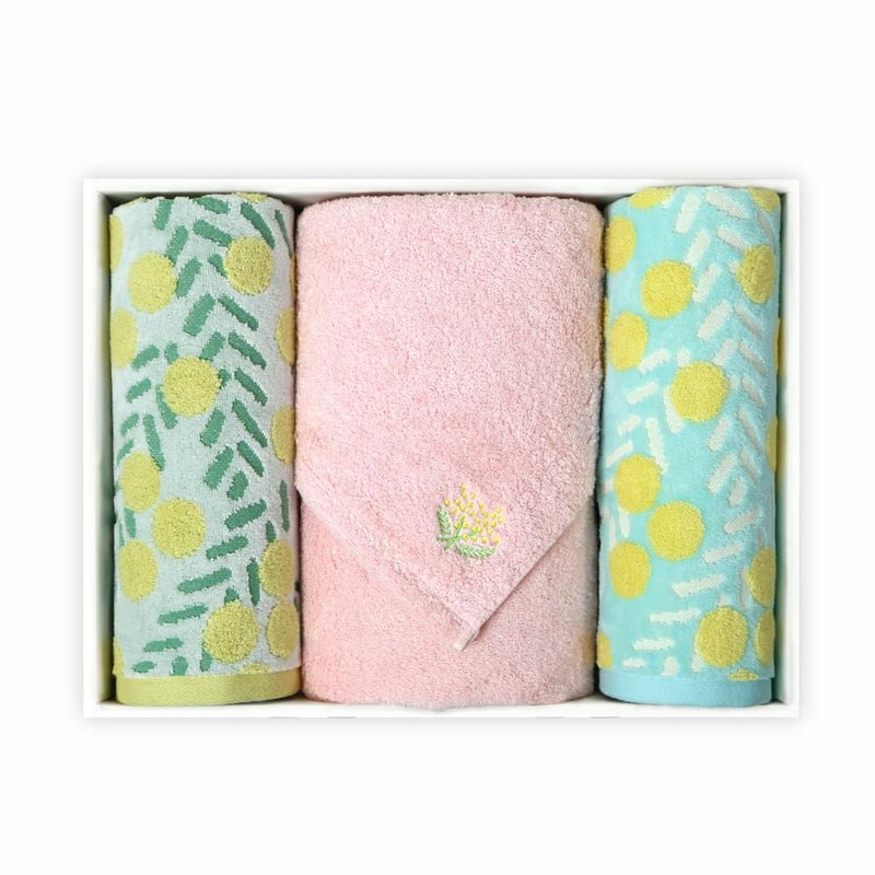 やわらかいだけでなく程よい弾力も感じていただける、その名の通りやさしい肌ざわりの『IORINO/やさしさ』スリムバスタオルと、たっぷりの光を浴びて満開のイエローの花を咲かせる様子を表現した『mimosa-ミモザ』フェイスタオル2枚をお入れした3枚組ギフトセットです。