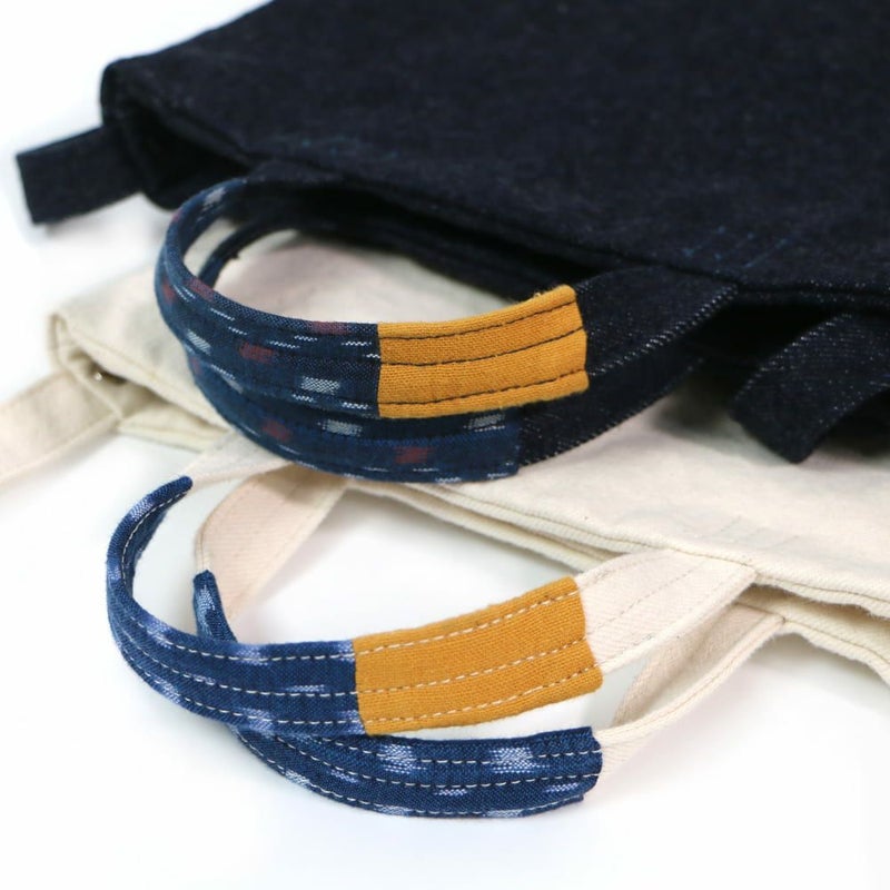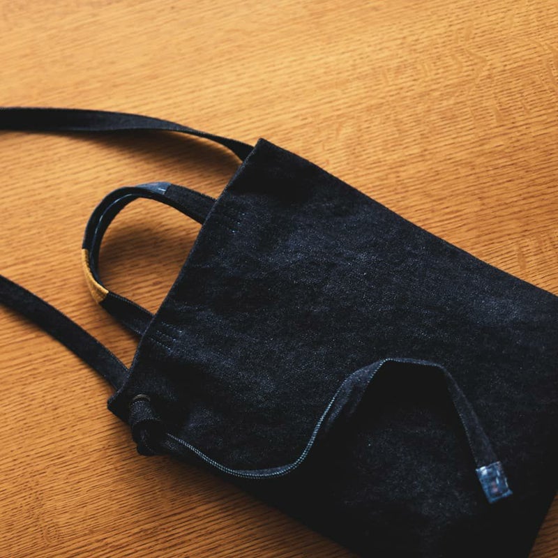 - ハンドルの当て布(伊予かすり)部分は特に摩擦が起きやすく、使い込むことでほつれたり破れたりすることがあるかもしれませんが、長年履き込んだジーンズのように経年劣化を楽しんでいただければ幸いです。