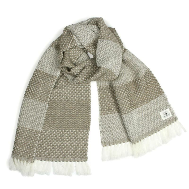 北欧テイストのカラーリング、かわいいへリンボンのあたたかマフラー。大きなへリンボン、小さなへリンボン、変形ワッフル織りと3つの変わり織り柄をボーダー状に組み合わせました。