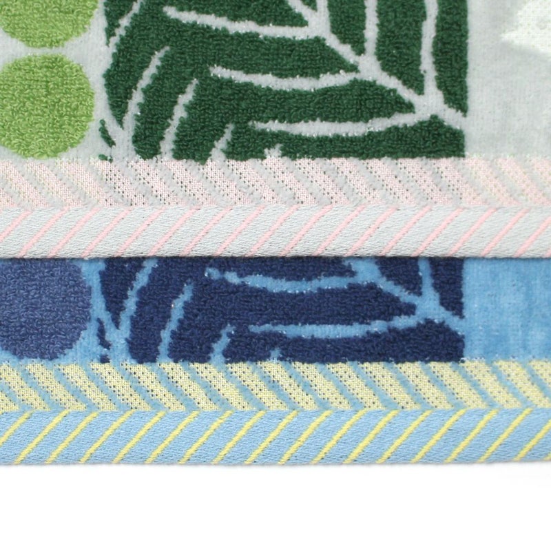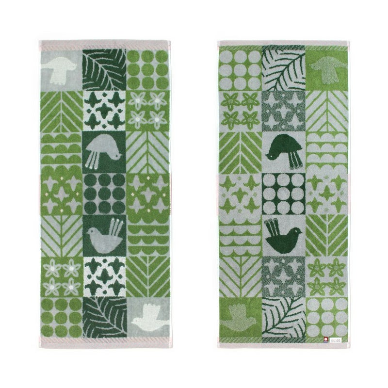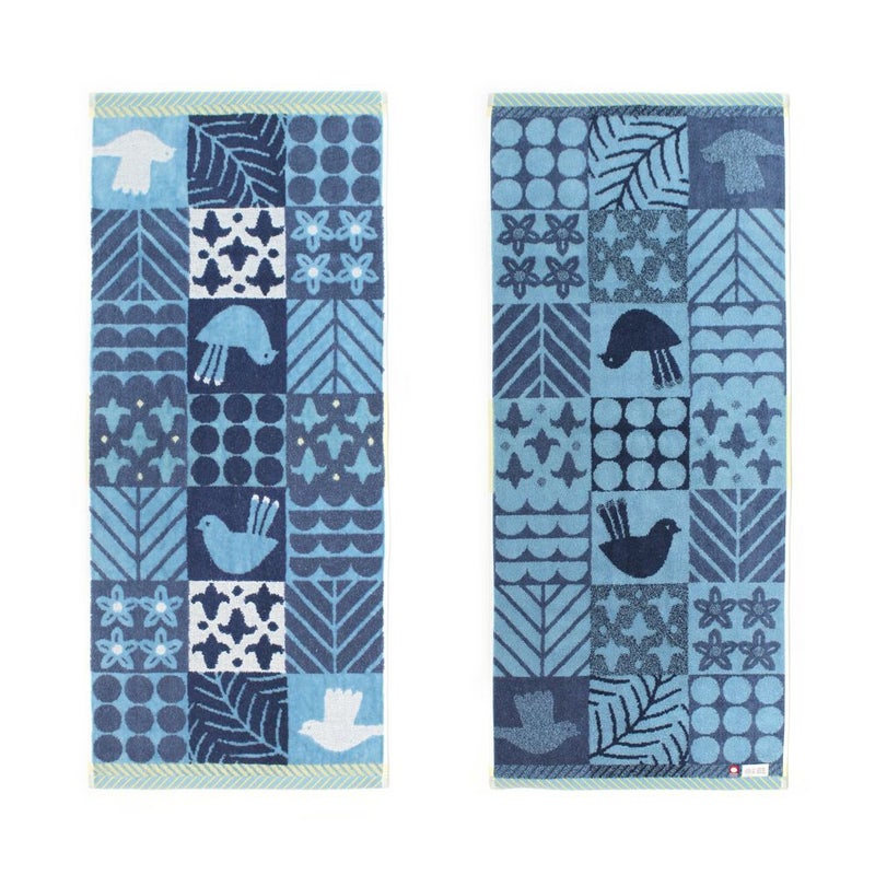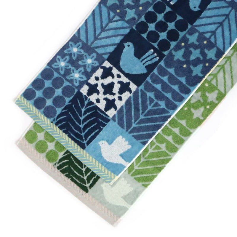 「沢山のモチーフがぎゅっと集まったデザインは一見大胆に感じられるかもしれませんが、どちらも森や自然を意識したブルーとグリーンの暮らしに馴染みやすい配色を意識してつくられています。柄物タオルがお好きな方に、フェイスタオルとハンカチタオルをお揃いで贈るのも◎