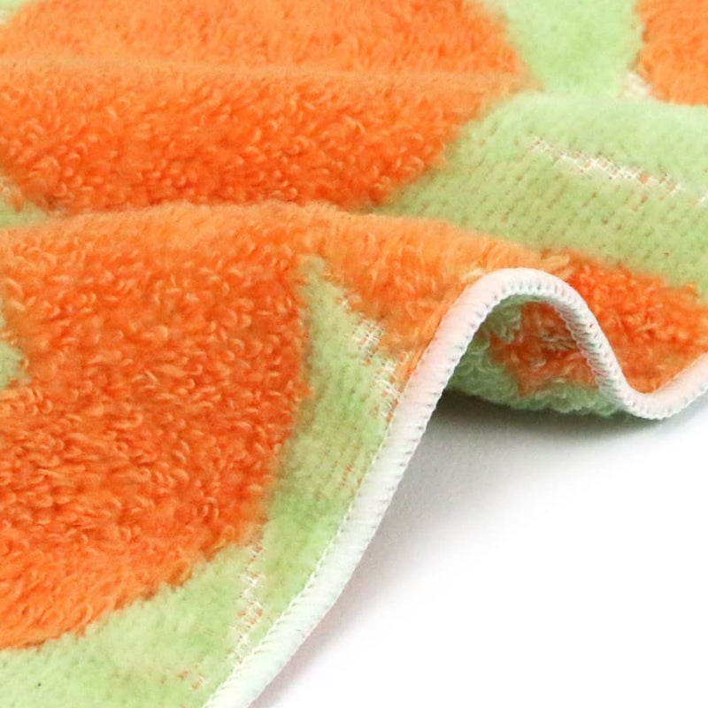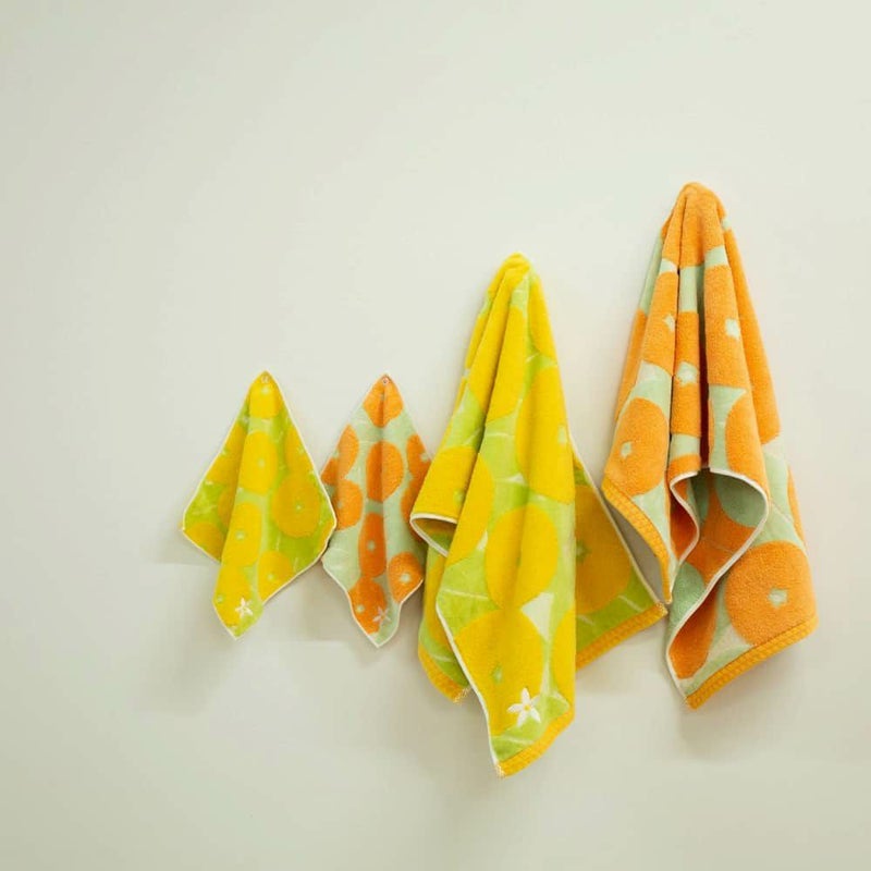 ふっくらと柔らかな無撚糸と、サラサラな手触りが心地よいシャーリングを組み合わせた、伊織の得意なファブリック・スタイルなタオル。愛媛を代表する柑橘「伊予柑」をモチーフに、たわわに実った伊予柑の甘酸っぱい香りが漂ってくるような爽やかなタオルです。