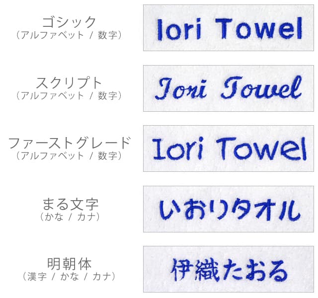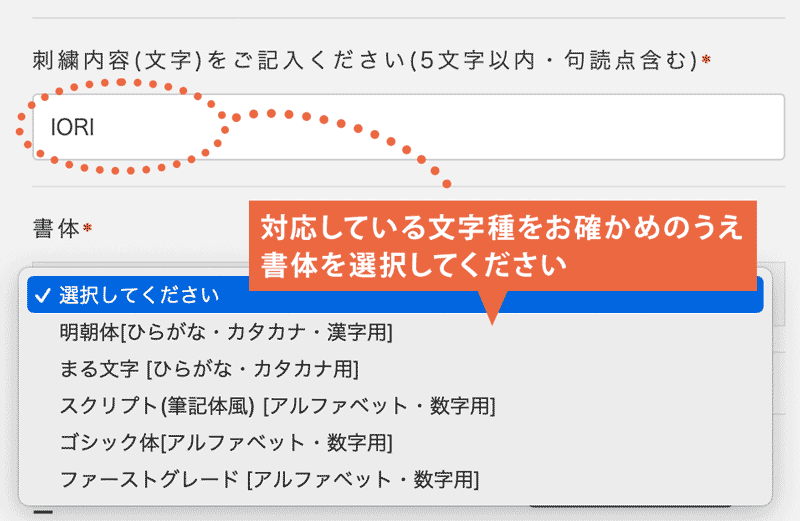 刺繍する文字種(ひらがな、カタカナ、漢字、アルファベット)に対応している書体をお選びください。