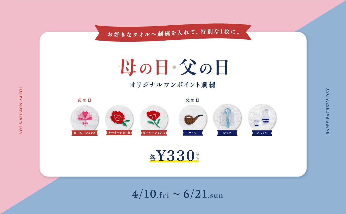 タオル専門店「伊織」“母の日・父の日刺繍”対象店舗に足をお運びください!